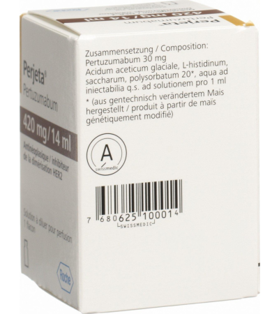Противоопухолевый препарат. Пертузумаб представляет собой рекомбинантные гуманизированные моноклональные антитела, которые избирательно взаимодействуют с отвечающим за димеризацию внеклеточным субдоменом II HER2 (рецептора эпидермального фактора роста человека 2 типа). Связывание пертузумаба с субдоменом II блокирует процесс лиганд-зависимой гетеродимеризации HER2 с другими белками семейства HER, включая EGFR (рецептор эпидермального фактора роста человека), HER3 (рецептора эпидермального фактора роста человека 3 типа) и HER4 (рецептора эпидермального фактора роста человека 4 типа). Таким образом, пертузумаб ингибирует лиганд-инициированную передачу внутриклеточных сигналов по двум основным сигнальным путям: путь митоген-активированной протеинкиназы (MAP) и путь фосфоинозитид-3-киназы (PI3K). Угнетение данных сигнальных путей способно привести к остановке роста клеток и апоптозу, соответственно. Кроме того, пертузумаб способствует активации антитело-зависимой клеточной цитотоксичности (АЗКЦ).