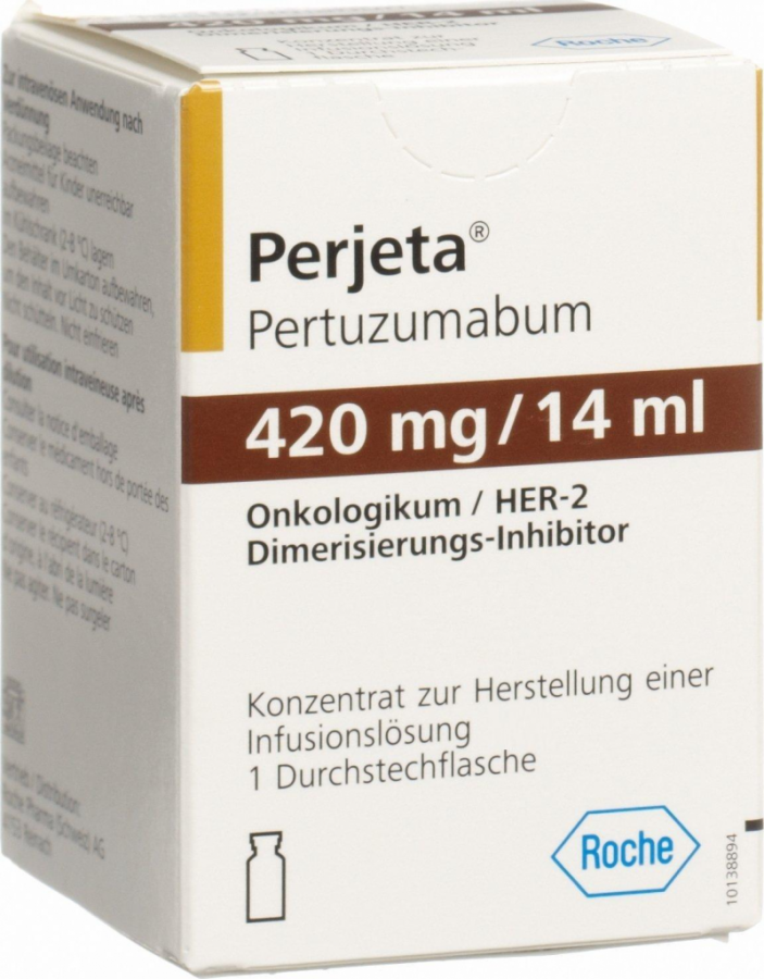 Противоопухолевый препарат. Пертузумаб представляет собой рекомбинантные гуманизированные моноклональные антитела, которые избирательно взаимодействуют с отвечающим за димеризацию внеклеточным субдоменом II HER2 (рецептора эпидермального фактора роста человека 2 типа). Связывание пертузумаба с субдоменом II блокирует процесс лиганд-зависимой гетеродимеризации HER2 с другими белками семейства HER, включая EGFR (рецептор эпидермального фактора роста человека), HER3 (рецептора эпидермального фактора роста человека 3 типа) и HER4 (рецептора эпидермального фактора роста человека 4 типа). Таким образом, пертузумаб ингибирует лиганд-инициированную передачу внутриклеточных сигналов по двум основным сигнальным путям: путь митоген-активированной протеинкиназы (MAP) и путь фосфоинозитид-3-киназы (PI3K). Угнетение данных сигнальных путей способно привести к остановке роста клеток и апоптозу, соответственно. Кроме того, пертузумаб способствует активации антитело-зависимой клеточной цитотоксичности (АЗКЦ).