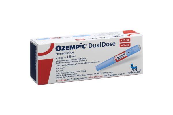 Каждая ручка содержит 1,5 мл раствора и выдает дозы 0,25 мг или 0,5 мг. Раствор Ozempic DualDose для инъекций в предварительно заполненной шприц-ручке доступен в упаковках следующих размеров: 1 предварительно наполненная шприц-ручка и 6 одноразовых игл NovoFine® Plus.