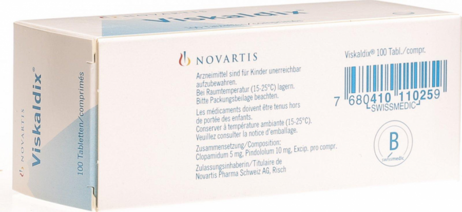 - Пероральные гипогликемические средства и инсулин (хотя и с более низкой вероятностью; пиндолол, т.к. он является бета-адреноблокатором с СМА, может усиливать гипогликемические эффекты гипогликемических средств так, что гипогликемию можно распознать только по повышенной потливости). Больные сахарным диабетом, применяющие Вискалдикс, должны научиться распознавать гипогликемические эпизоды по возникновению повышенной потливости. Клопамид может ослабить эффекты гипогликемических средств для приема внутрь.